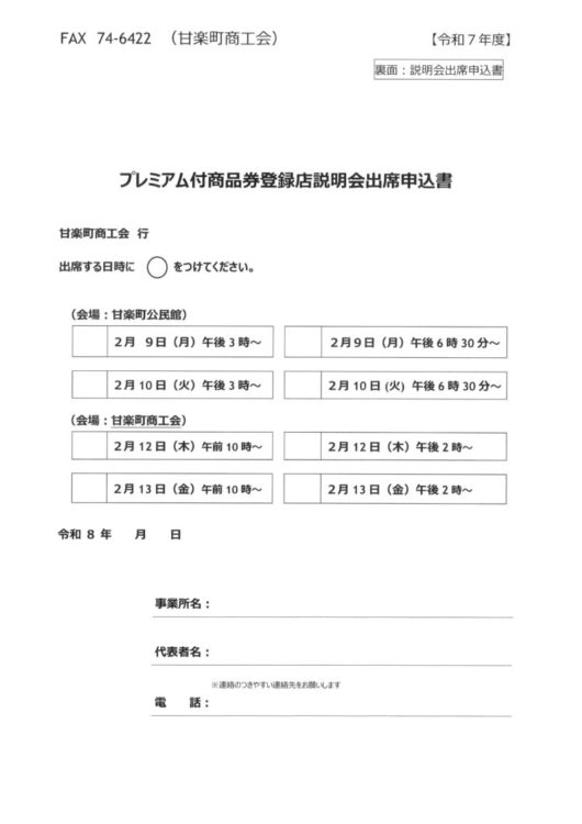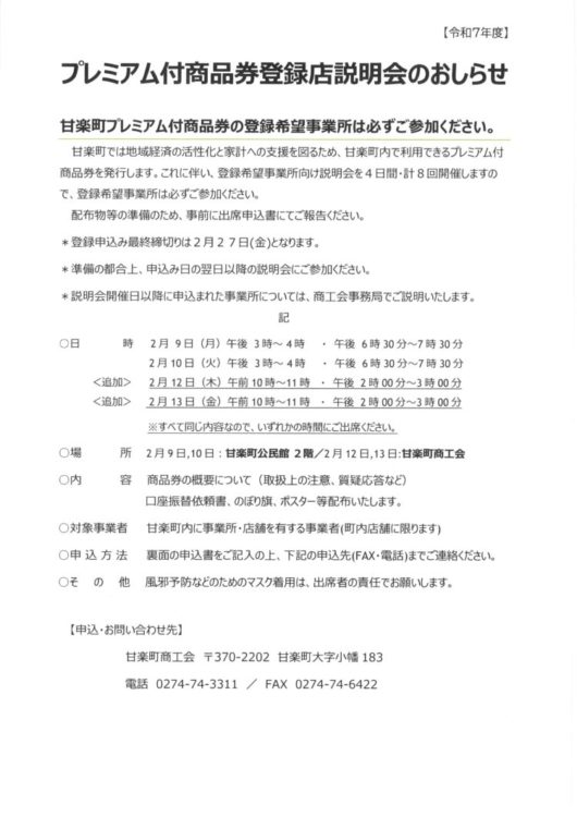 | - 申込・問い合わせ先 -甘楽町商工会 〒370-2202 甘楽町大字小幡183 電話 0274-74-3311 FAX 0274-74-6422 |